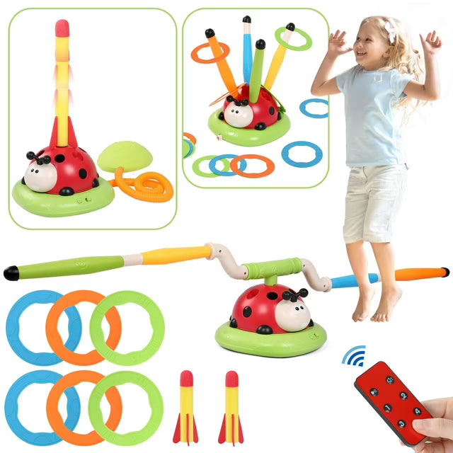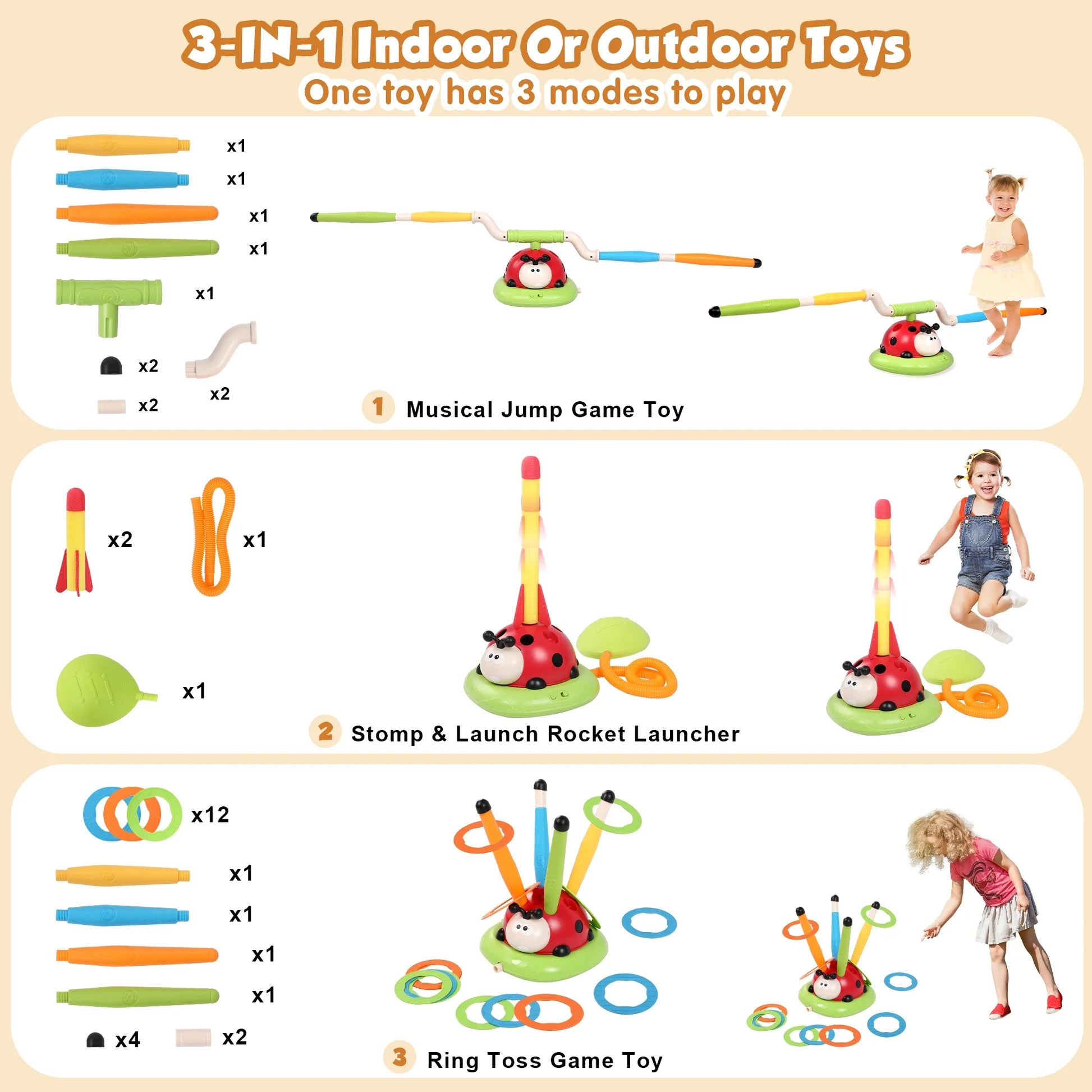 This 3‑in‑1 children's activity machine combines automatic jump‑rope spinning, electric ring toss, and a stomp‑powered rocket launcher into one fun-filled unit—perfect for enhancing coordination, rhythm, and energetic play.