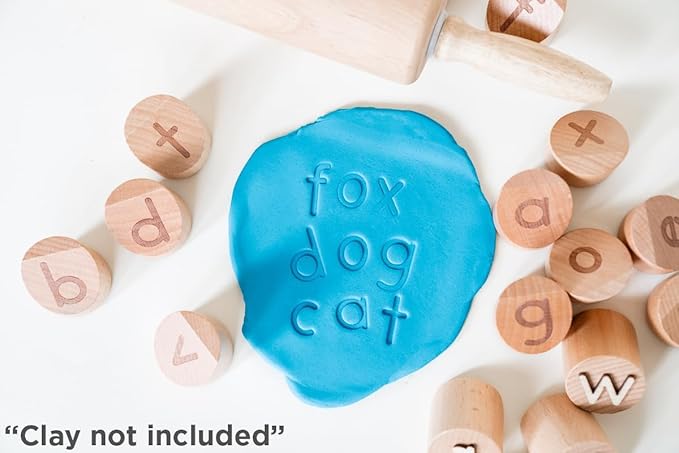 A beautifully crafted wooden stamp set featuring 26 lowercase letters and one bonus logo stamp. Each circular stamp (about 1.5″ × 1.5″ or 3.8 × 3.8 cm) is laser-engraved for clarity and designed for little hands. The packaging doubles as storage and includes a printed letter template inside—combining organization with playful learning.