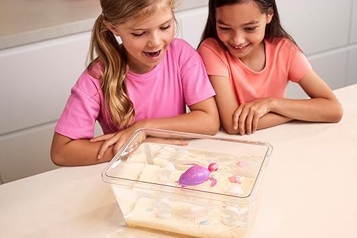 A surprise robotic turtle toy that hatches baby turtles from 4 eggs, swims when placed in water, walks on land, and offers endless repeatable fun via a resettable mechanism.