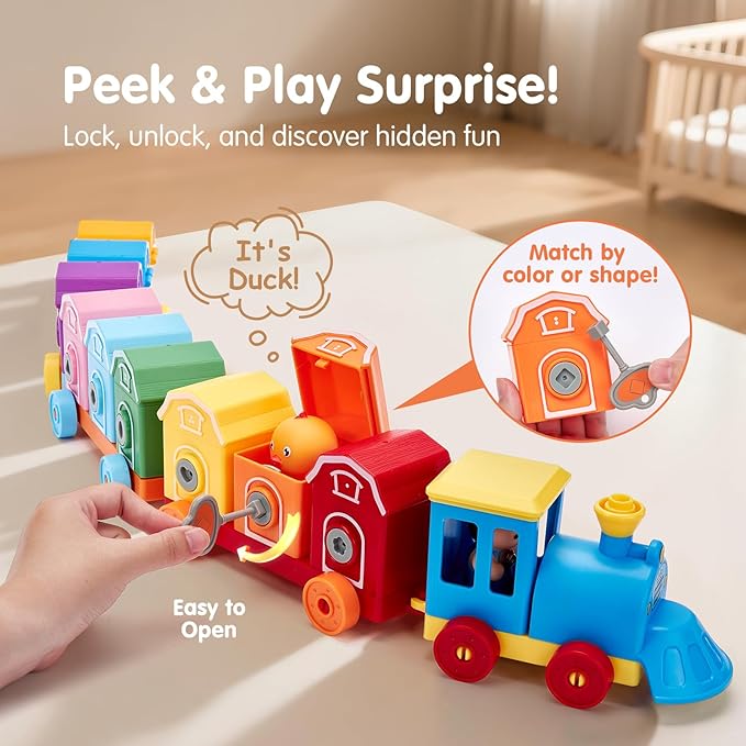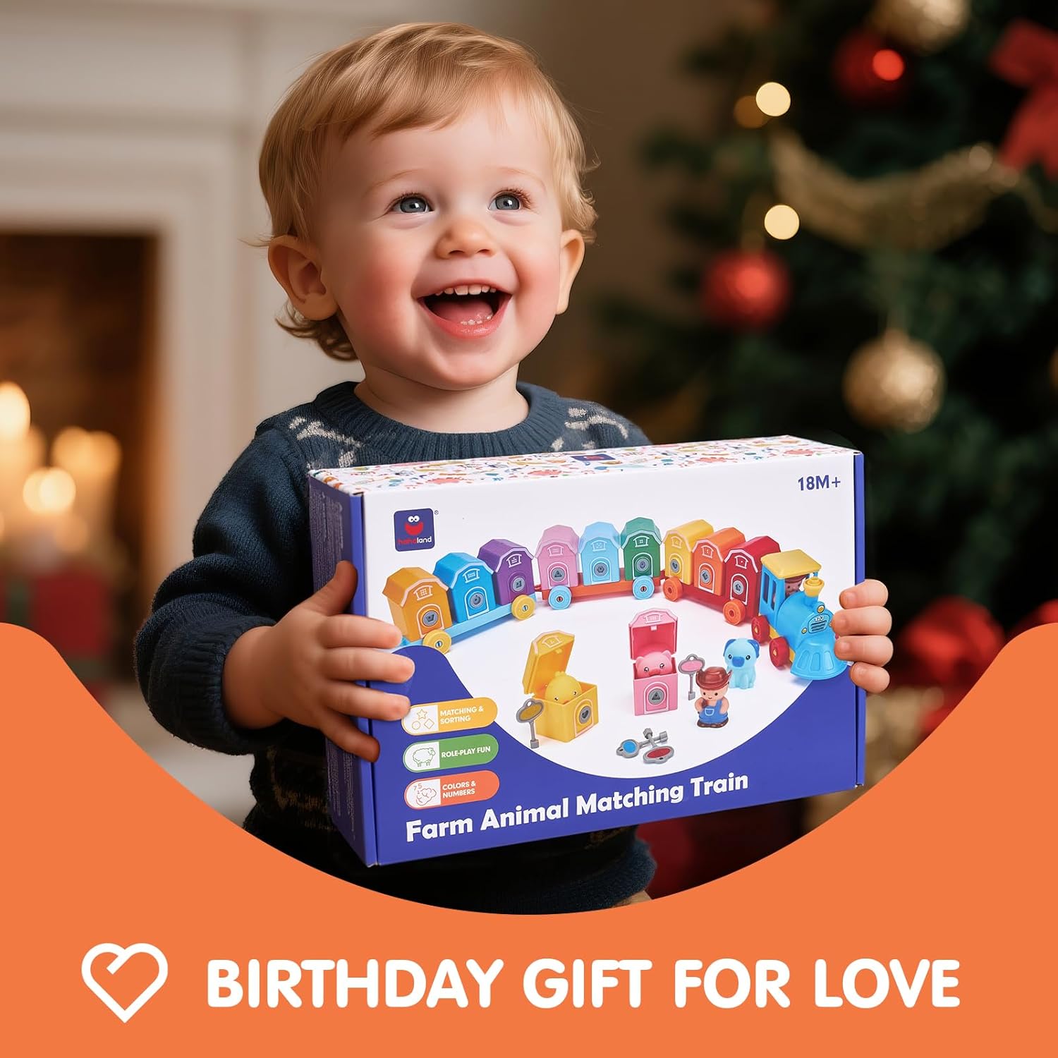 A colorful farm-themed train playset designed to teach toddlers counting, color matching, and imaginative role-play. With numbered barns, matching keys, animal finger puppets, and a farmer, it makes learning fun and interactive while developing fine motor skills.