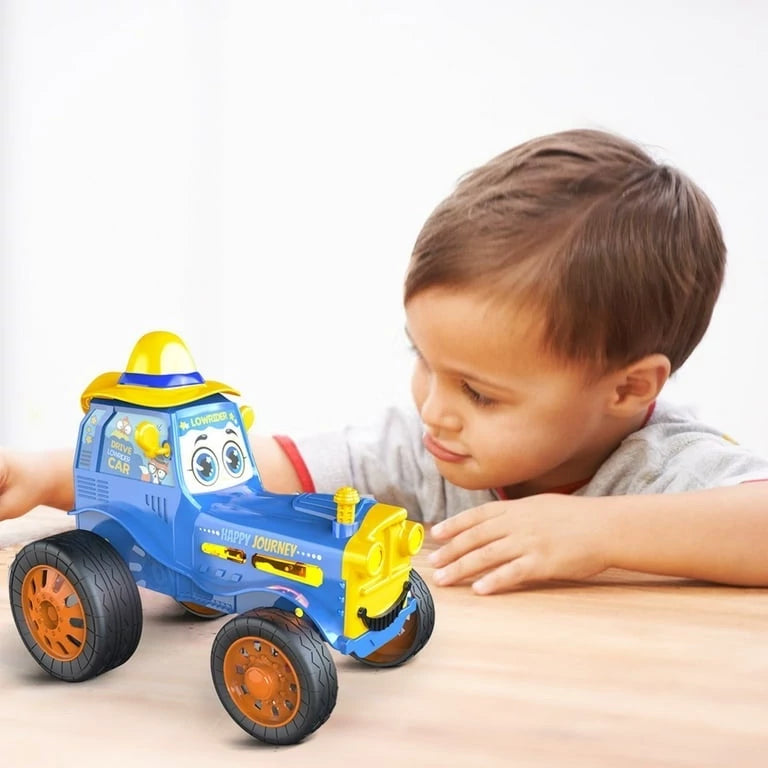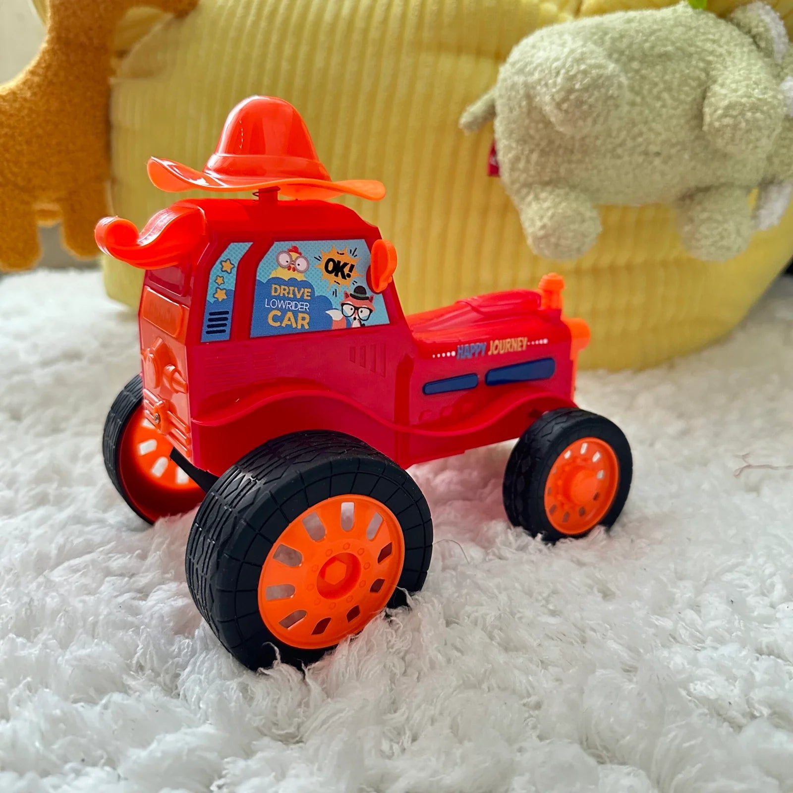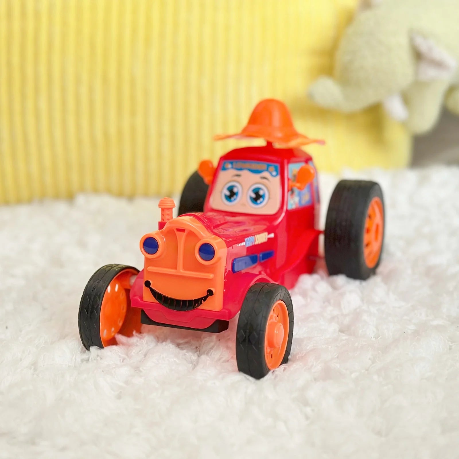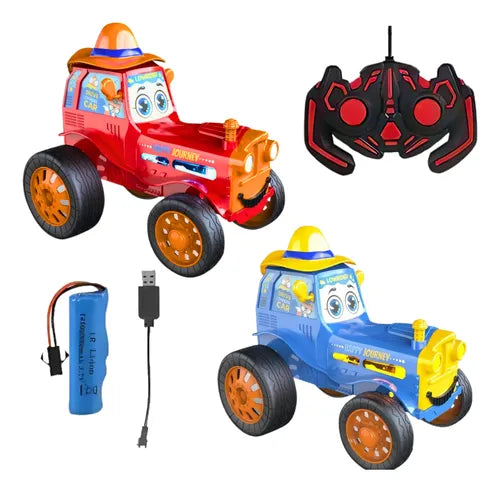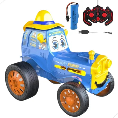 High-speed remote-control stunt car with jumping action, music, LED lights, and 360° spins—perfect for fun-filled play indoors or outdoors.