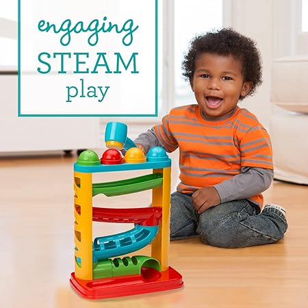 A brightly colored ball tower toy designed for babies and toddlers (12M+), featuring a kid-sized hammer and balls that drop through rings to roll down slides. It promotes fine motor development, cause-and-effect learning, and hand-eye coordination.