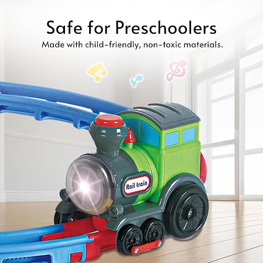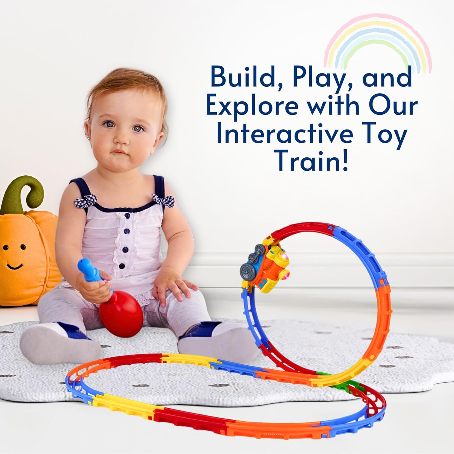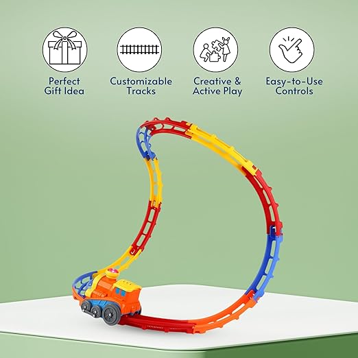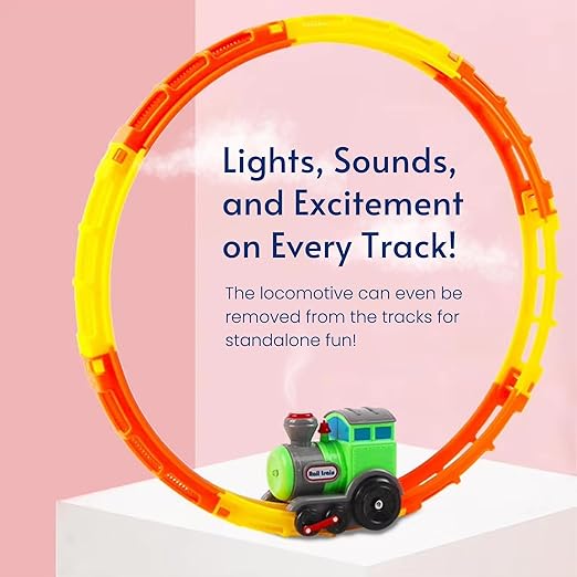 A vibrant motorized train set designed for kids aged 3+, featuring a musical start button, bright lights, and a customizable 16-piece track layout—perfect for joyful and engaging playtime.