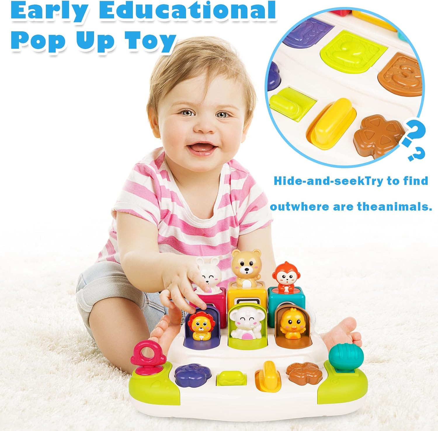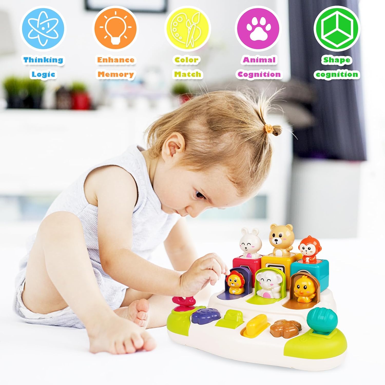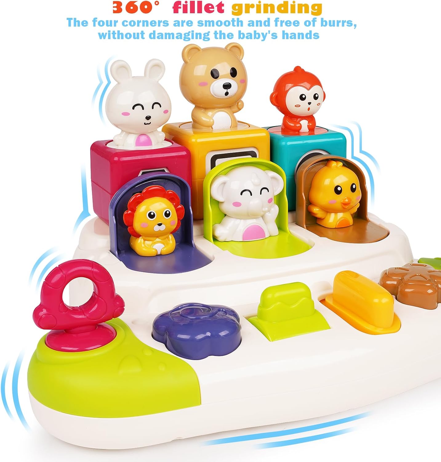 A colorful surprise box featuring four animal characters (like a cat) that pop up when the switch is pressed, teaching babies early cause-and-effect in a playful and engaging way.