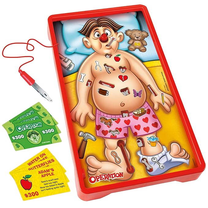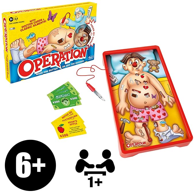 The classic Operation board game featuring Cavity Sam challenges players to remove 13 quirky ailments using tweezers—without touching the edges, which trigger a buzzer and light-up nose. A fun, skill-building game for kids (and nostalgic adults alike) that helps develop motor skills and concentration while delivering plenty of laughs.