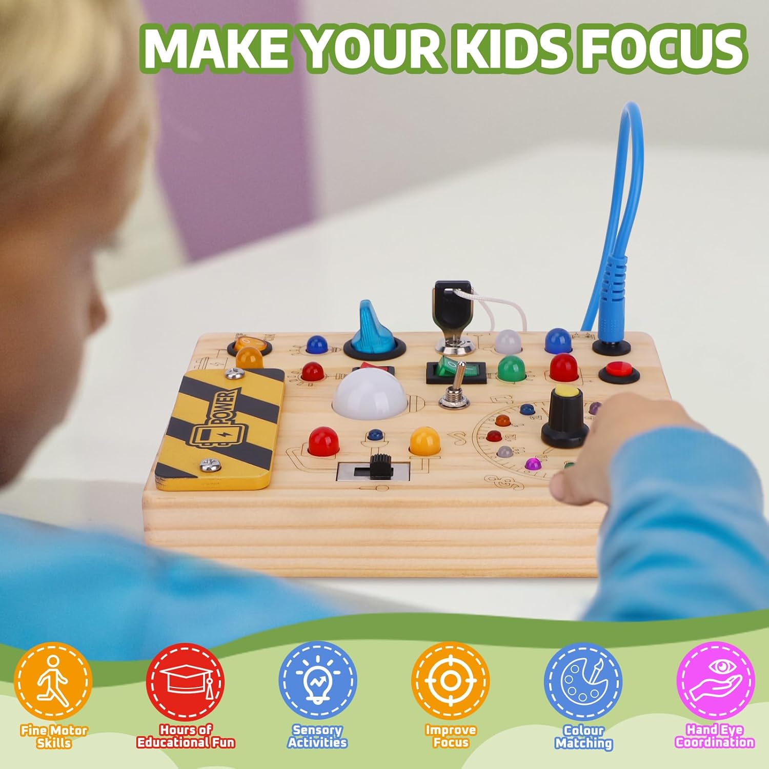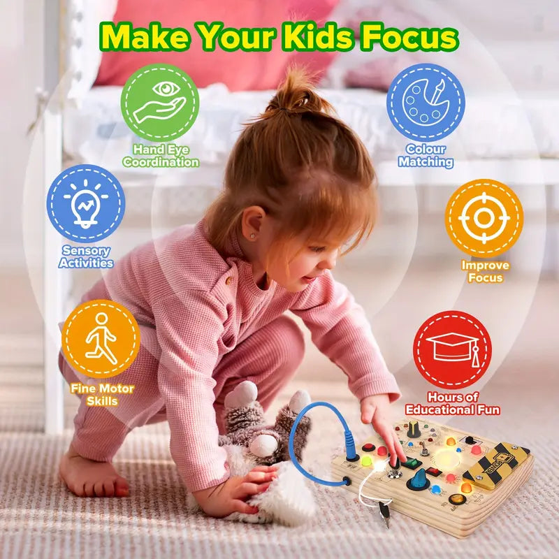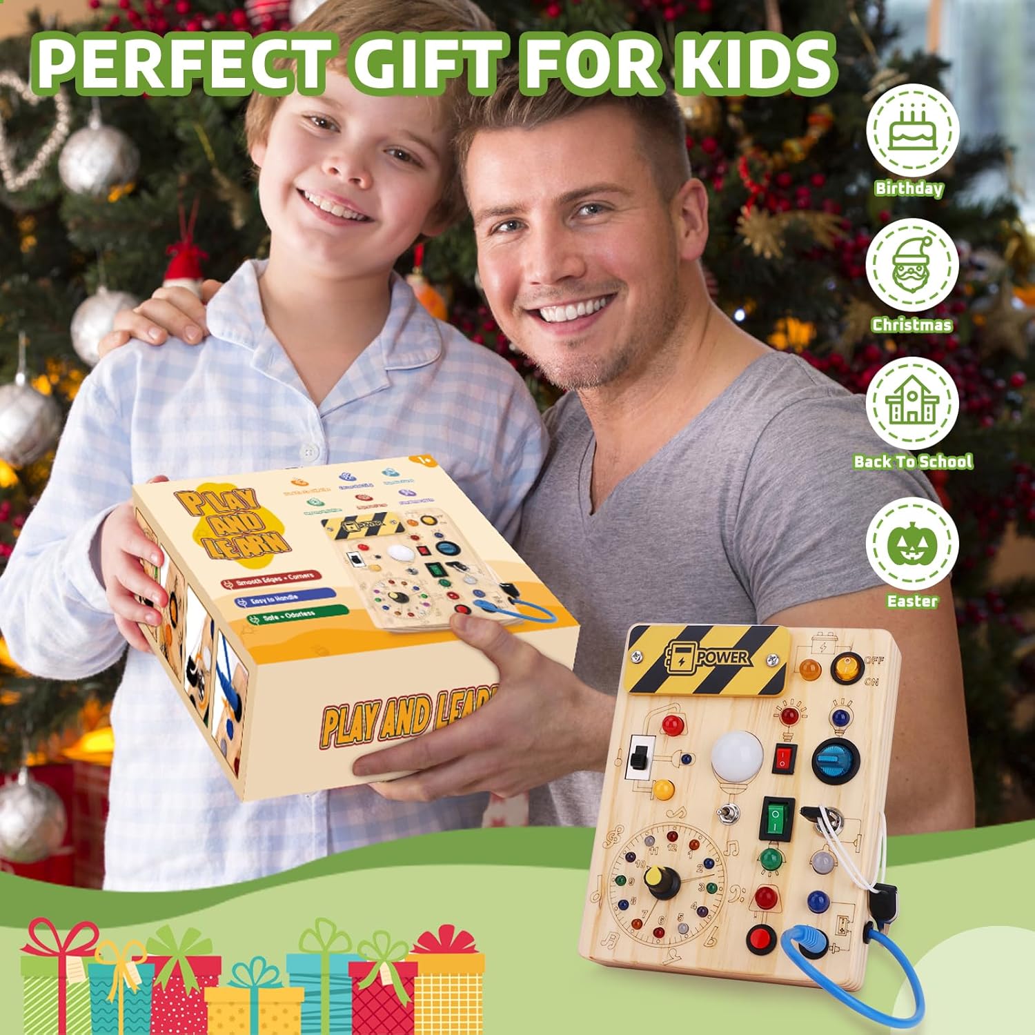 Spark your child’s curiosity with this Wooden Busy Board featuring LED light switches, gears, a clock, and hands-on learning activities. Designed to engage toddlers in safe, screen-free play that develops fine motor and cognitive skills.